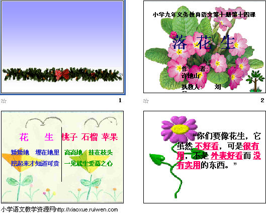 课件中把课文的主要重点展示出来,既生动又形象,让学生一目了然。这样,通过对比,学生很快就能知道这篇课文是按“种花生——收花生——尝花生——议花生”的顺序,重点记叙作者一家人过花生收获节时议论花生的好处,借物喻理,告诉我们做人要做有用的人,不要做只讲体面而对别人没有好处的人。