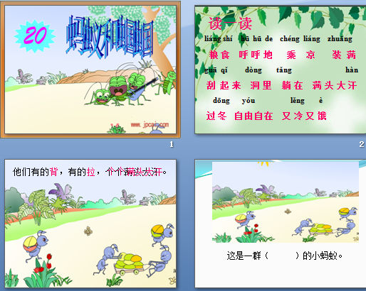 简介:苏教版语文一年级下册《蚂蚁和蝈蝈》 ppt课件 只有辛勤劳动,才有幸福生活。23张幻灯片。